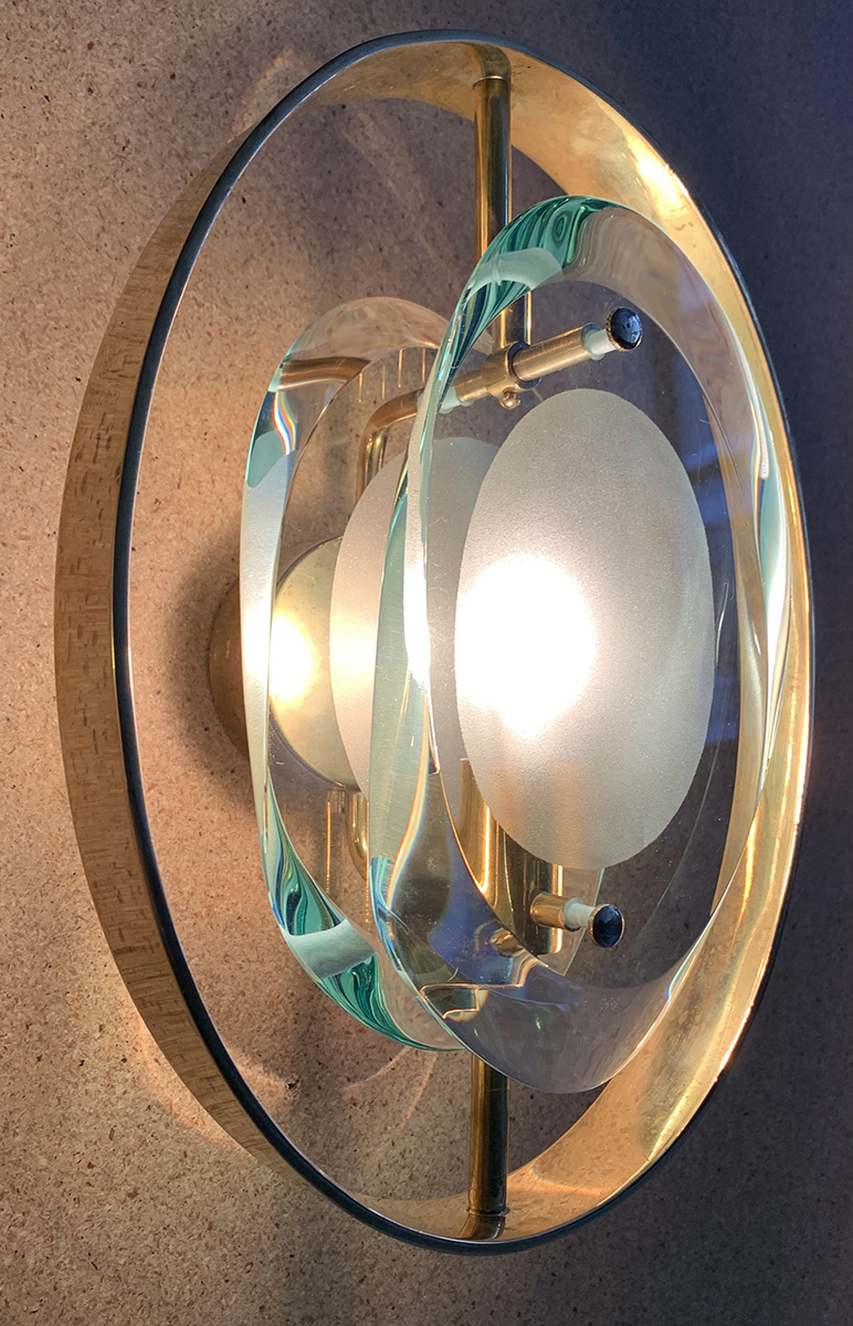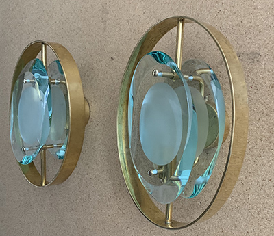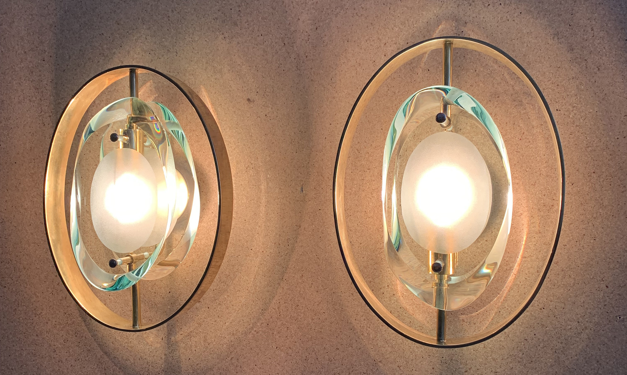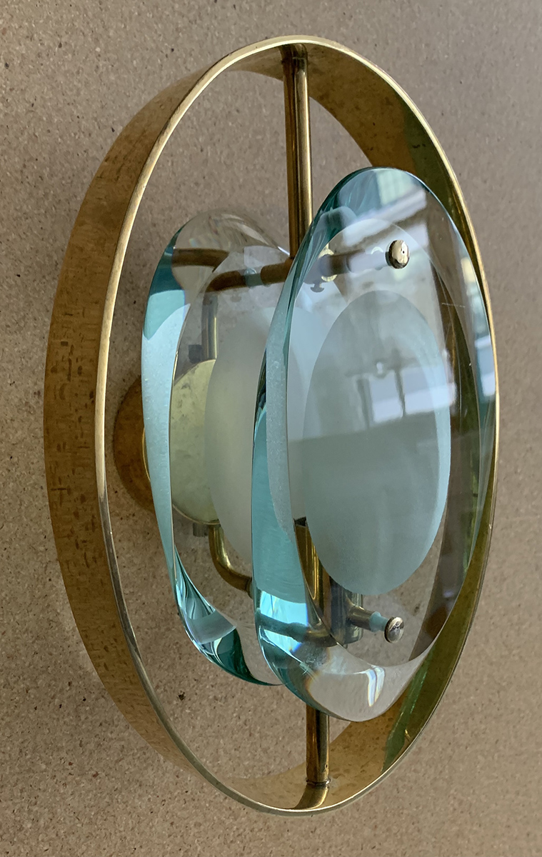 number 740 Fontana Arte by Max Ingrand Sconces c. 1960 Brass and glass 11.8" h x 8.6" wide x 5.5" deep Italy