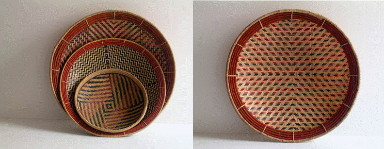 From the plains of the Colombian southeast, the men of the Tucano and Cirano tribes elaborate this beautiful balays. Women dont are included because of the hard work involved. The fiber used comes from the Yarumo cane, it is colored with natural dyes, and finally is hand woven from the center to the perimeter. The Balays have been used for generations for holding grains or for storage of other foods. | |