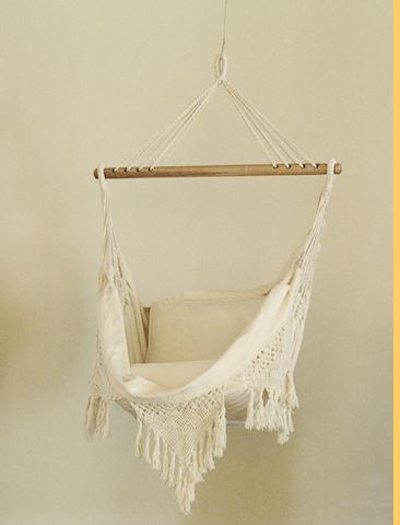 Hand-woven cotton hammocks bordered with macramé and supported by a wooden harness. The harness connects to the ceiling in a contemporary reinvention of the way hammocks were originally used. They come from the plains of Arauca (northeast of Colombia), called the land of the raising sun. | |||||||