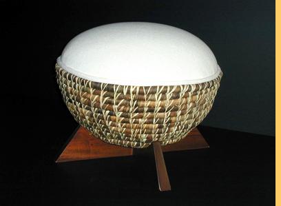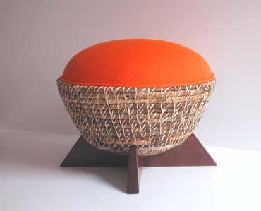 Cone puffs are made from Colombian hard wood, banana tree fiber, Iraca palm, and upholstery. Colors: orange and off white. | ||||||